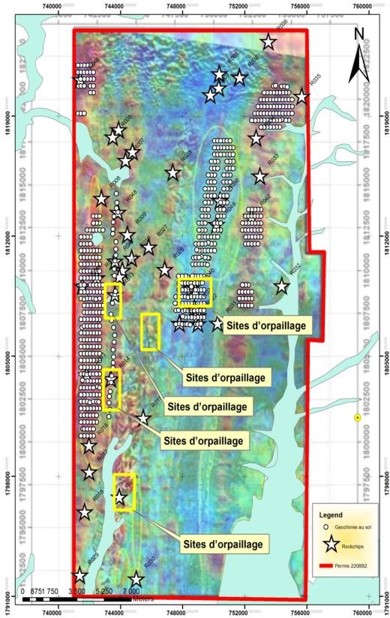 The work was realized in accordance with the terms of reference relating to the study and according to the technical requirement of soil geochemistry and rocks in general. The area of permit 2928B2 is 91km². About 19.78% of the surface of the permit has been covered by works.